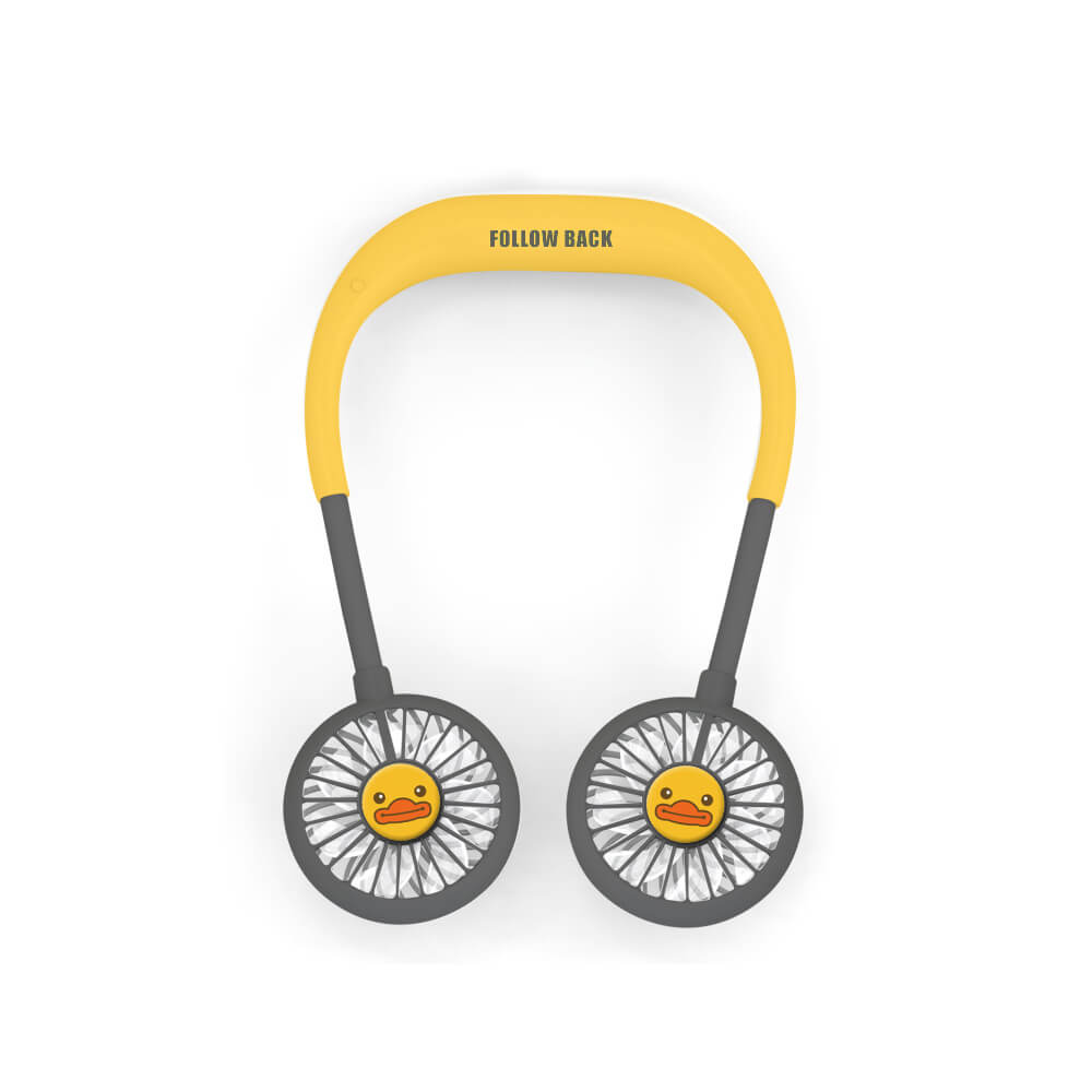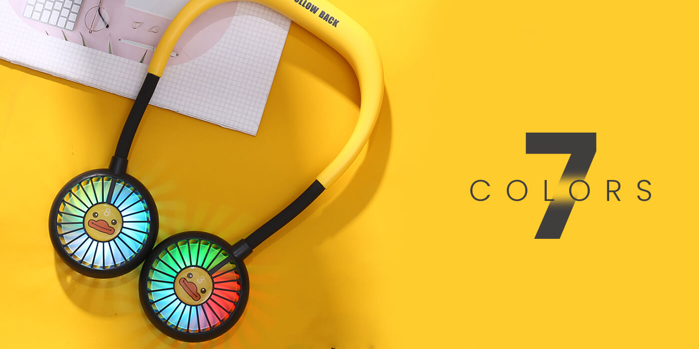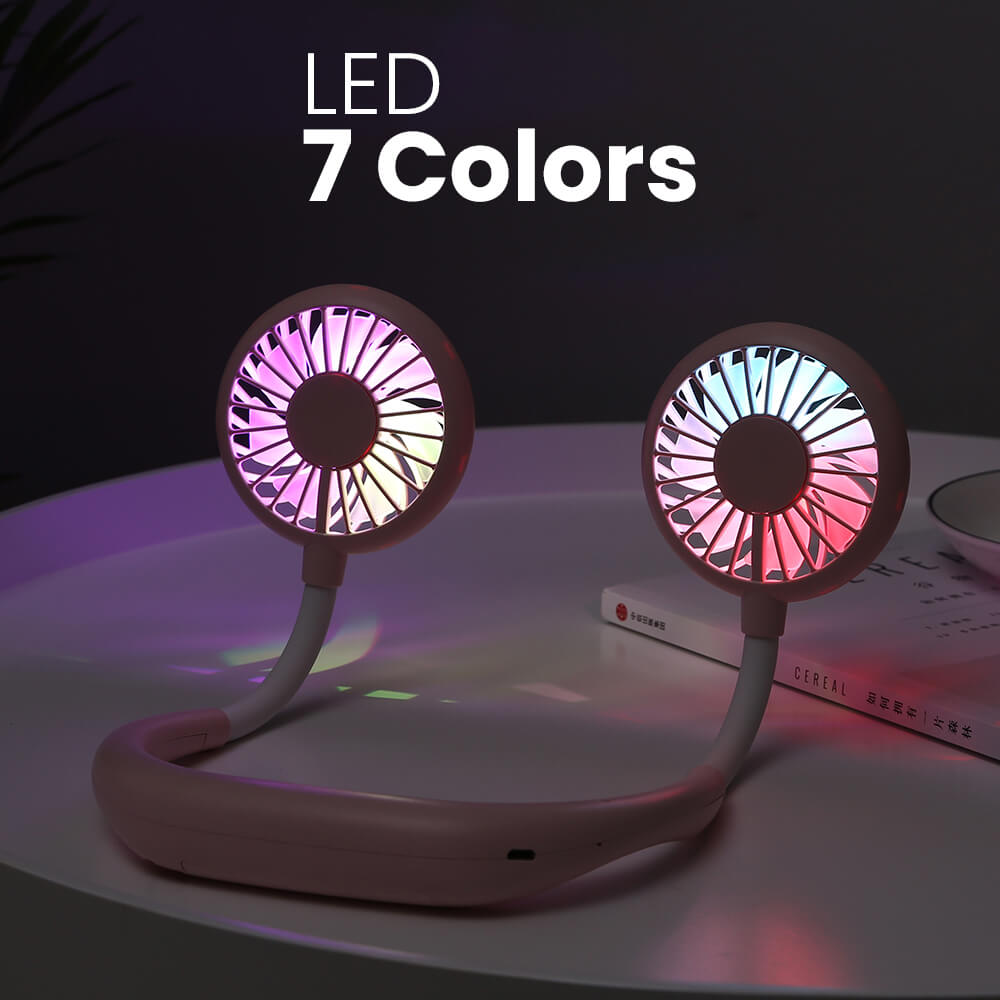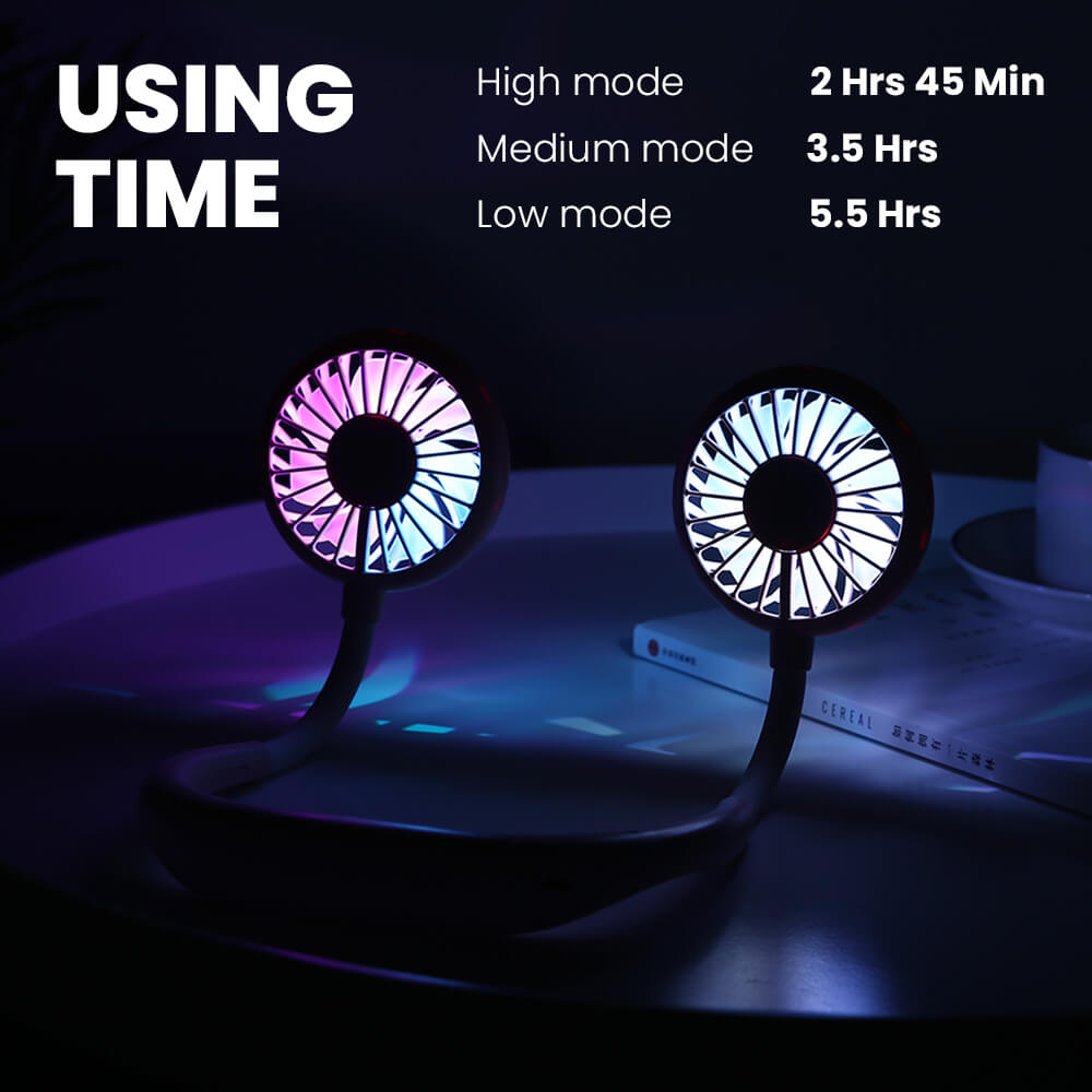 5. A Pivoi USB rechargeable, battery-operated neck fan ergonomically designed allows you to hang the fan around your neck comfortably. This hanging USB neck fan has a 2000 mAh lithium battery for extended operational hours. With 7 color LED lights, you can wear this portable neck fan while out on your night run to keep you cool as well as act as an indicator light.